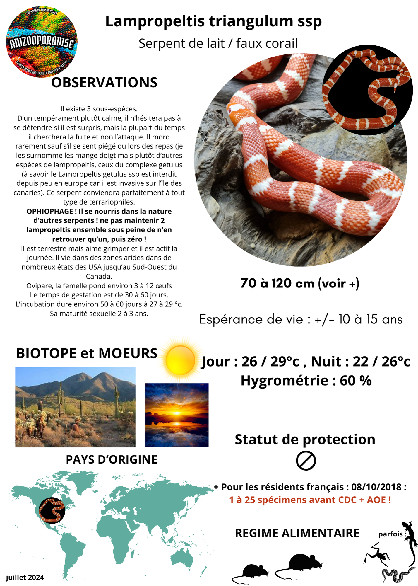 OPHIOPHAGE ! Il se nourris dans la nature d’autres serpents ! ne pas maintenir 2 lampropeltis ensemble sous peine de n’en retrouver qu’un, puis zéro !