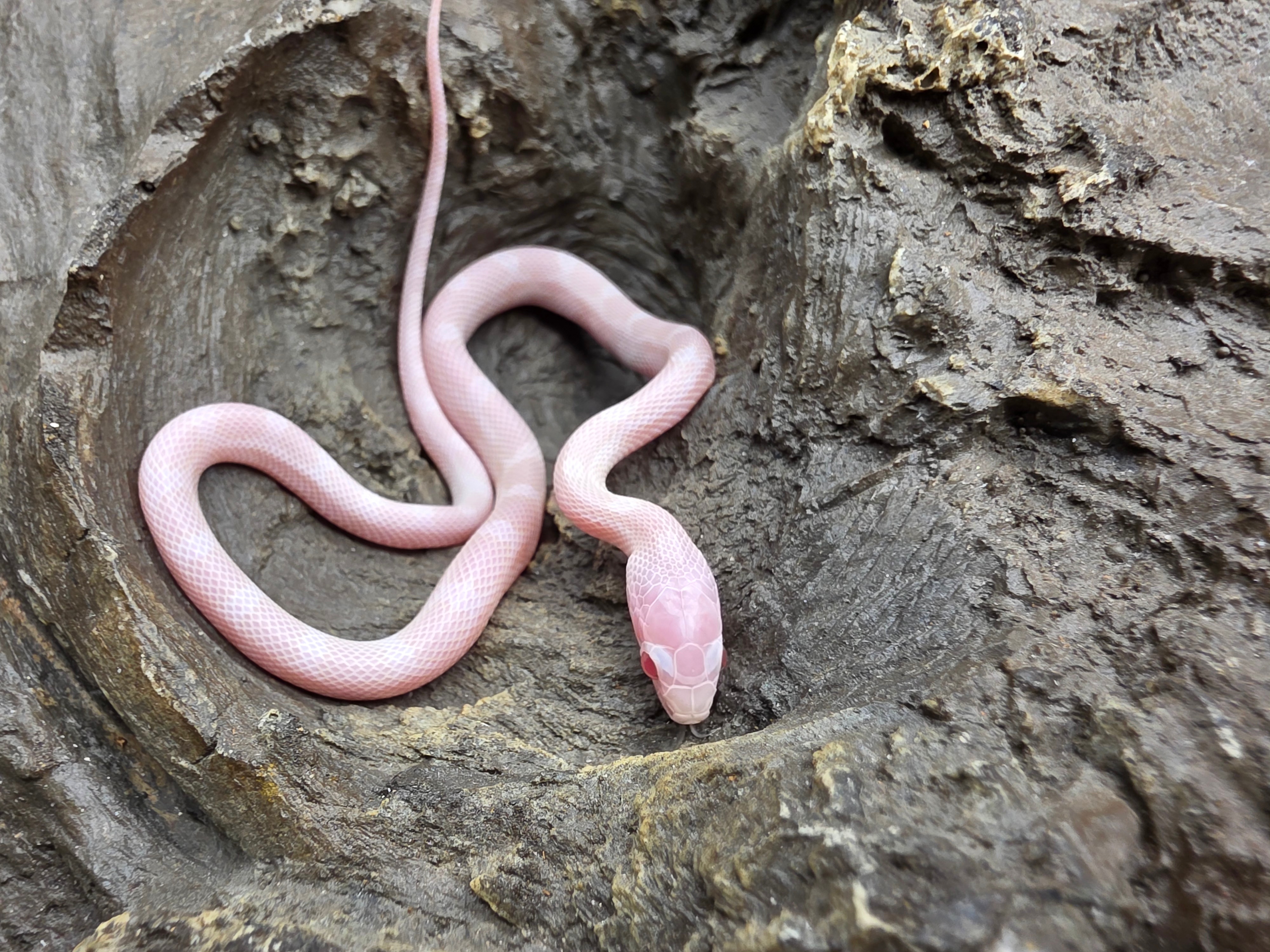 Pantherophis guttatus sp scaleless « Blizzard (possible whiteout) 100% het.anery 66% het.(blood) 50% het.caramel, piedside, scaleless 33% het.motley » Femelle 2025 Nom : ICA